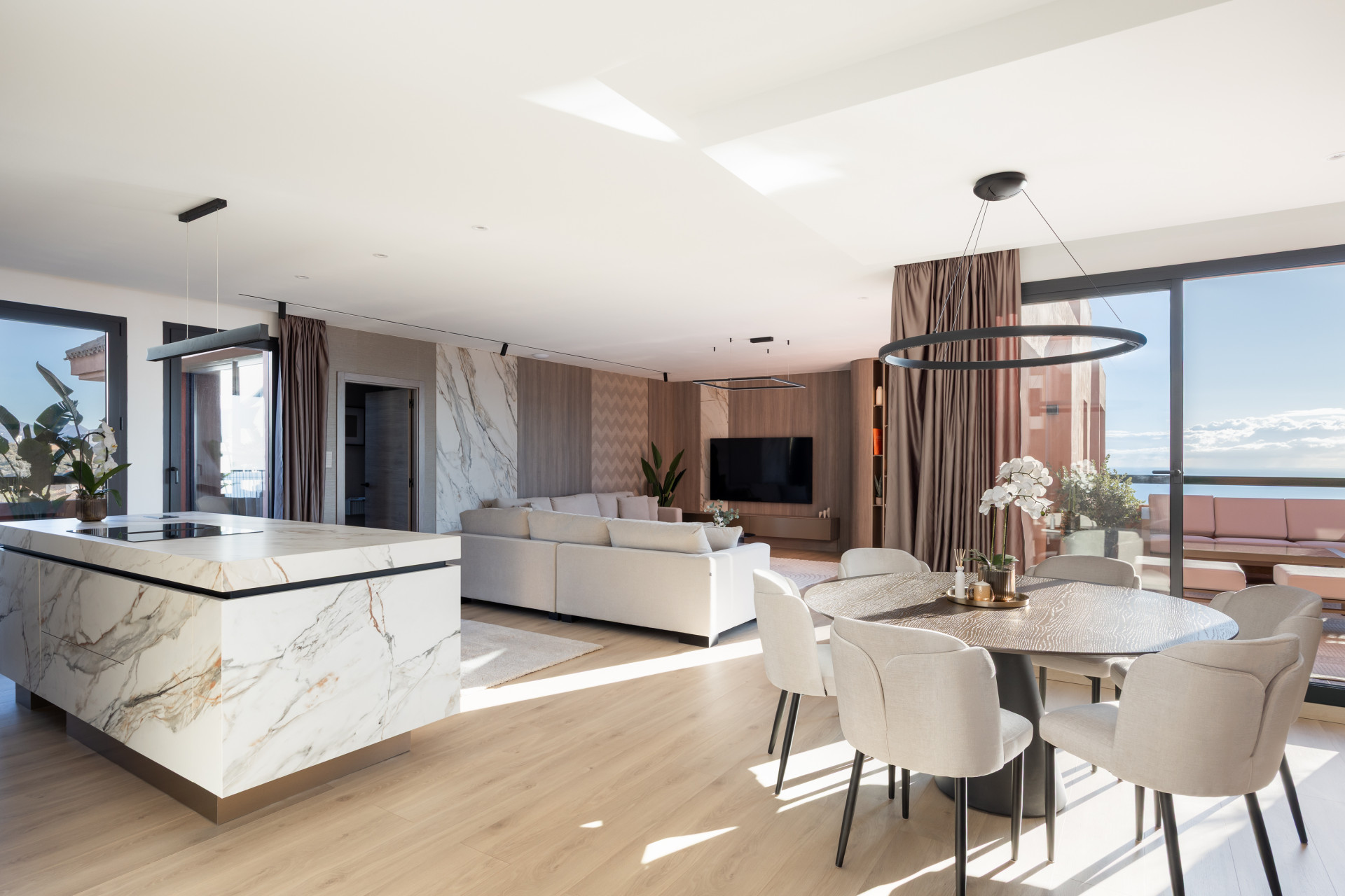 Elegant 3-bedroom residence near Marbella with 270° sea views, two terraces, jacuzzi, and premium smart home features.